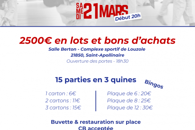 La section judo vous convie à son loto le Samedi 21 mars à partir de 18h30 (début des parties à 20h).